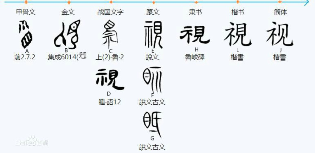 甲骨文上像“示”,下像“目”(图A)。示,既是声旁也是形旁,表示祭告。金文调整成左右结构,左像“示”,右并将“目”写成“见”(图B)。籀文写成目、示会义,表示察看征兆。战国文字一个上“见”下“示”(图C);另一个左“示”右“见”(图D)。篆文承续金文字形。从见、示声(图E、F、G)。从“见”,表示观察;“示”表示音读,也兼表显示的意思。在六书中属于形声兼会意。《说文》又收有二个古文形体,一个是从目、示声;另一个是从目、氐声。隶书(图H)、楷书(图I)从战国文字、篆文来。 [6]