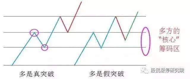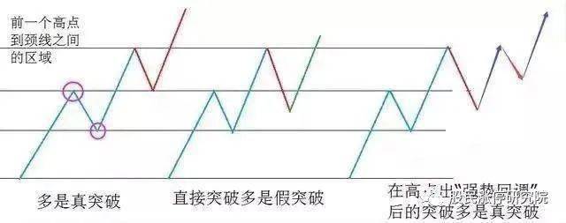 如果空方的反击跌破“前一个高点”,则说明空方的力度较大,空方进入多方的“核心”区间,上升趋势开始减弱,其后的突破高点时多方“力竭”,所以突破多是假突破。