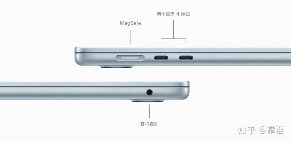 机身左侧有两个雷雳4(支持最大约70W PD充电和DP1.4视频输出)和一个MagSafe 3 充电口;机身右侧有一个3.5mm耳机接口。