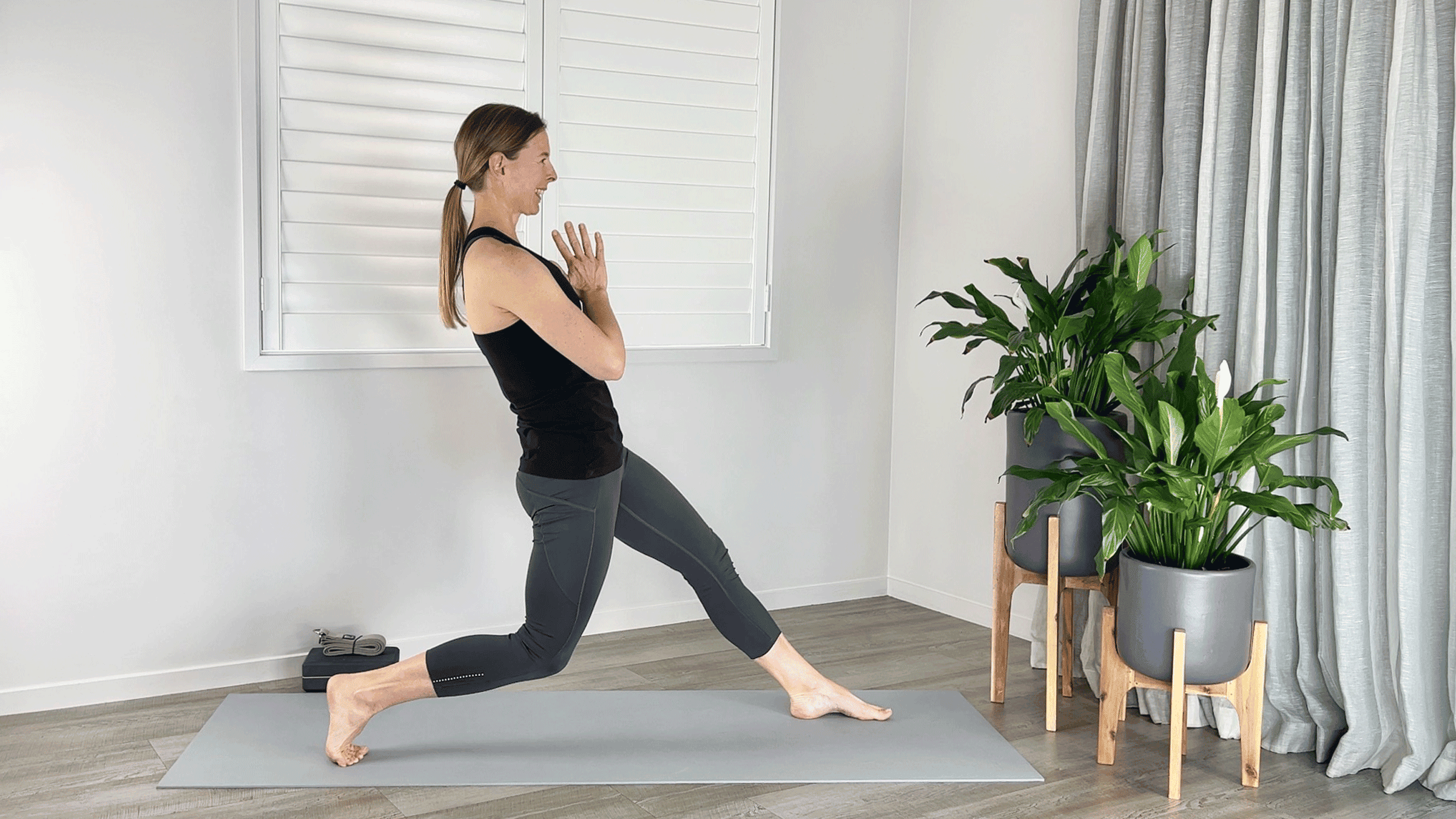 Bending your back knee approximately 90 degrees so it hovers just above the mat adds significantly to the quad work of High Lunge and to the stability challenge of the pose.