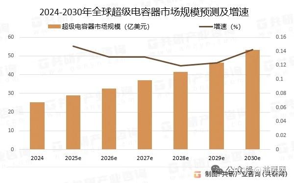 根据共研网研究,全球超级电容器市场规模将持续增长,预计2030年可达到53.1亿美元。