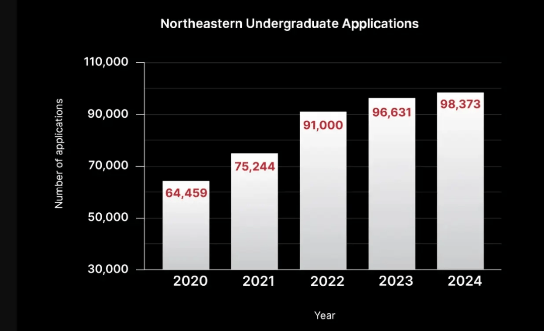 东北大学2024Fall收到了98,373份的本科申请,高于过去两年的96,327和91,000份。五年来,东北大学的申请者数量增加了53%,打破了申请纪录!申请成功率直逼藤校。