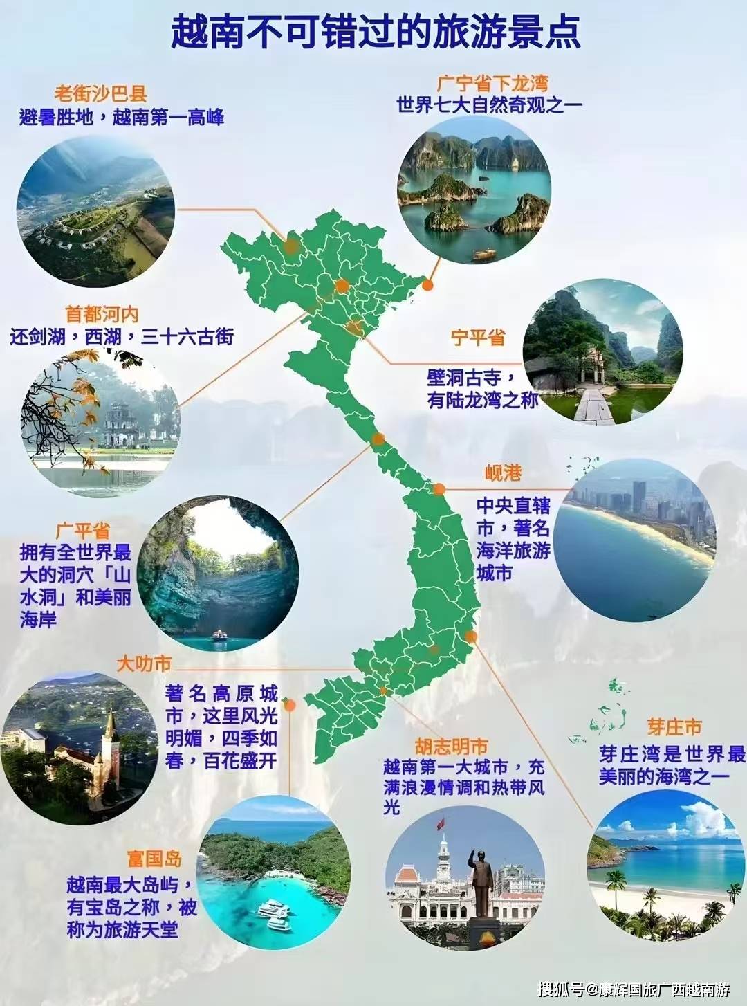 - 自然风光: 下龙湾(海上桂林)、沙坝梯田、丰芽格邦国家公园(世界最大洞穴)、美奈红白沙丘、富国岛海滩、中越海岸线(岘港、芽庄、美溪海滩)。