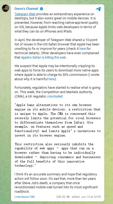 6 月 14 日消息,Telegram 创始人 Pavel Durov 再次在其平台的公共频道上批评苹果,这次他称苹果通过故意限制网络应用(Web App)的功能,这影响到了网络版的 Telegram。