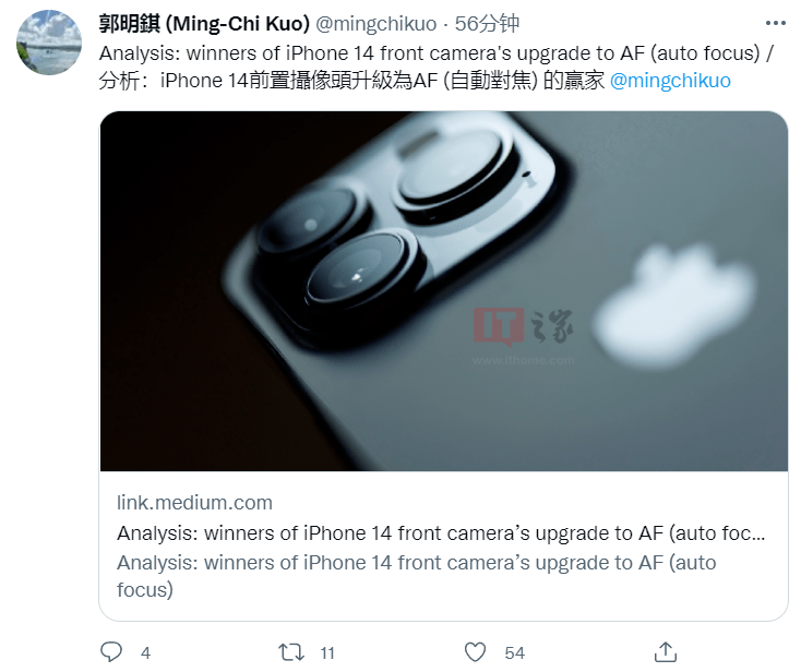 6 月 13 日消息,天风国际分析师郭明錤今日上午在推特发文,称 iPhone 14 系列的前置摄像头将升级为 AF 自动对焦,并曝光了前置摄像头的供应商。