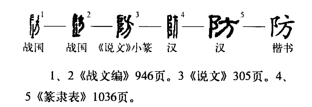 又《说文》:或作𨹛。《玉篇》:或作坊。《礼·坊记》:大为之坊,民犹逾之。注:坊,同防。