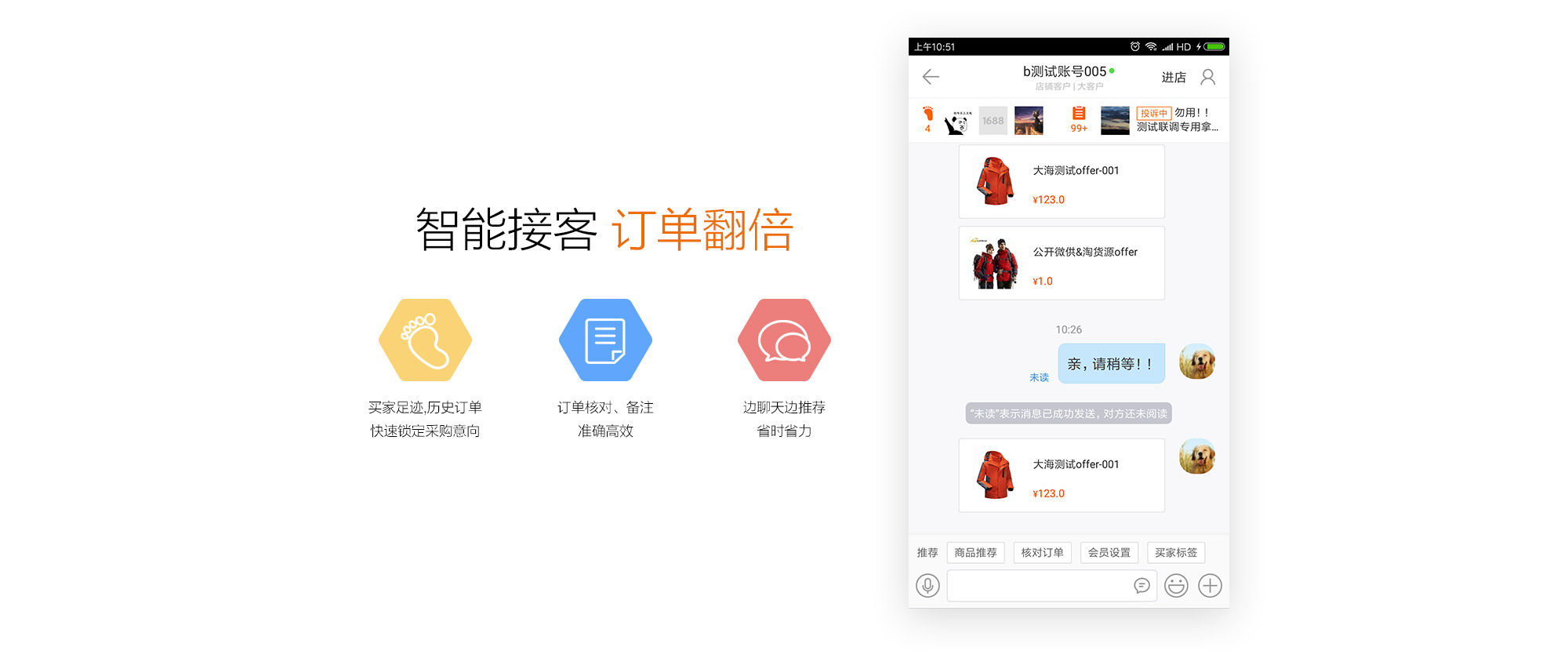 整体电商从PC端往无线端快速发展,我们的淘卖,天猫等下游客户的采购足迹,客户画像,手机一键推荐商品,查看店铺数据,使用移动快捷的操作工具,节省人力成本,提高客户响应率