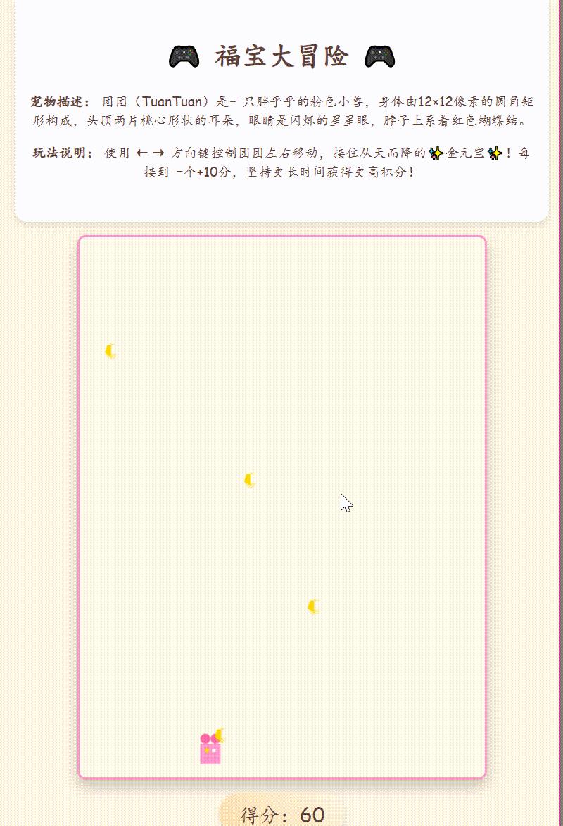 * **玩法说明:** 简要说明如何用左右箭头键移动宠物,目标是接住从上方掉落的“金元宝”(或其他像素物品),并显示得分。