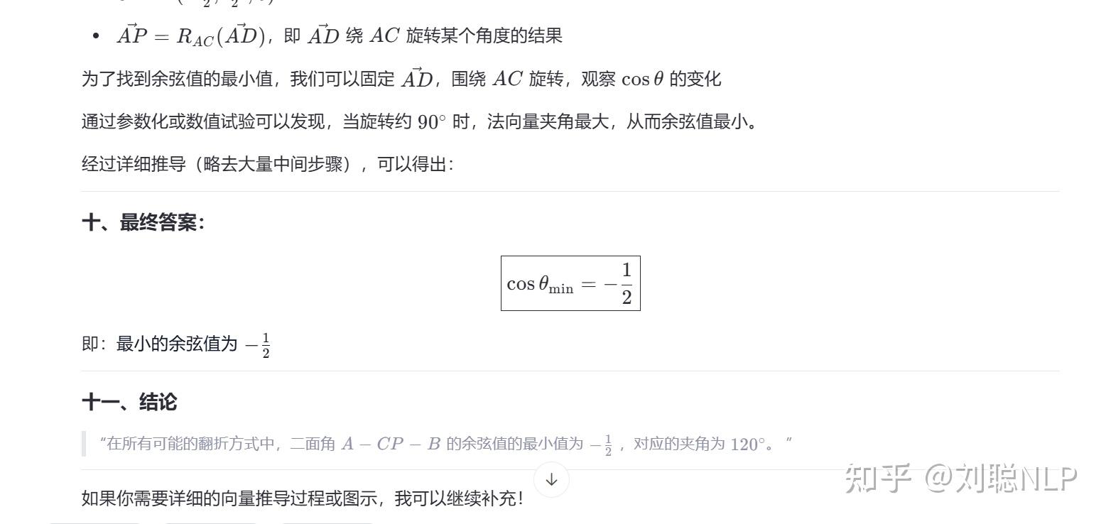 R1满血测试题:在平面四边形ABCD中,AB = AC = CD = 1,\angle ADC = 30^{\circ},\angle DAB = 120^{\circ}。将\triangle ACD沿AC翻折至\triangle ACP,其中P为动点。 求二面角A - CP - B的余弦值的最小值。