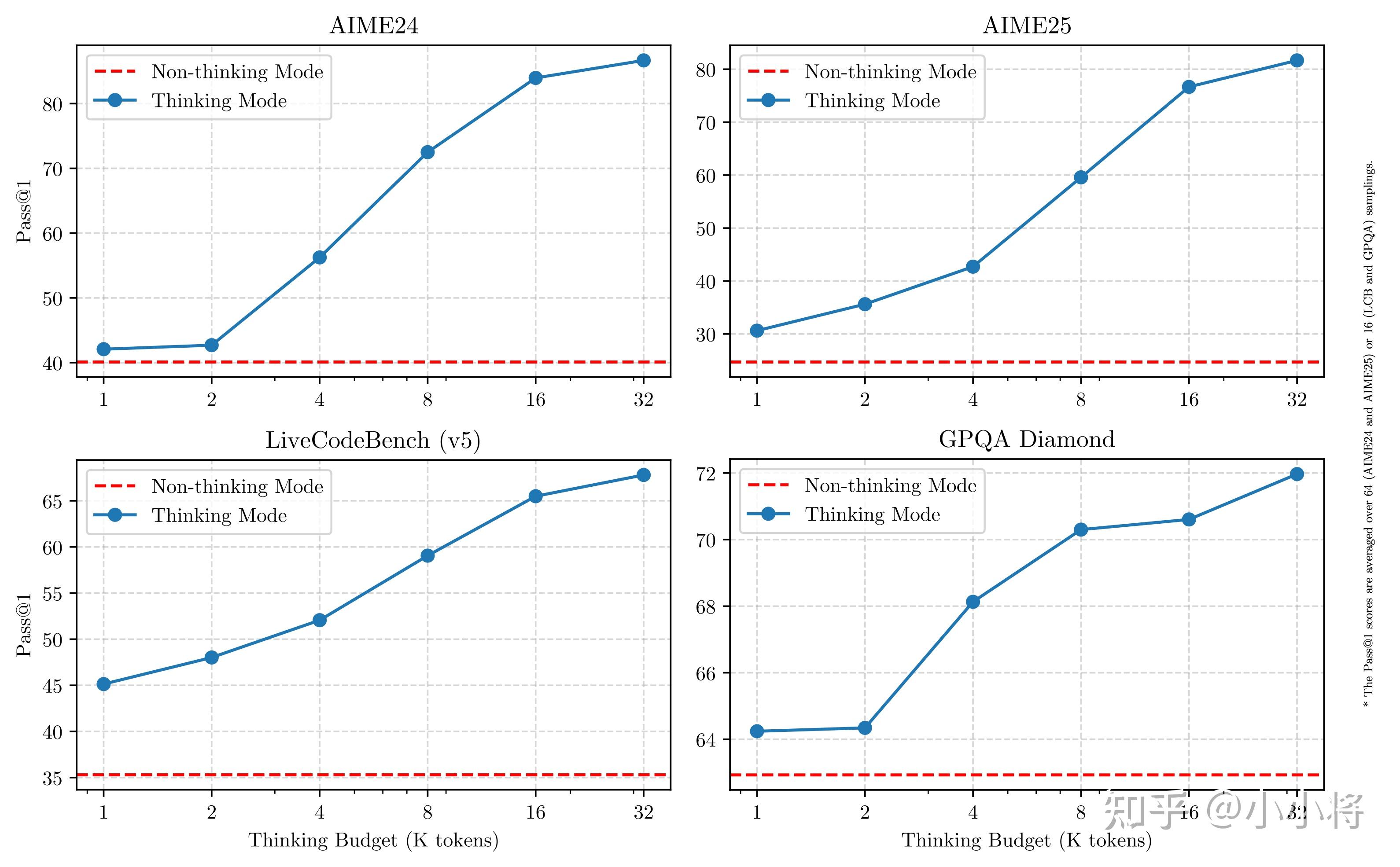 Qwen 3系列模型的另外一个亮点我觉得是支持混合思考模式,混合思考模式在Claude 3.7 Sonnet首次出现,前段时间谷歌最新的Gemini 2.5 Flash也是这种模式。混合思考模式可以实现一模两用:当用户开启思考模式,模型回答问题之前会经过深入思考,这适合需要复杂推理的任务;而当用户禁用思考模式时,模型提供快速、近乎即时的响应,适合一些常规任务。Qwen 3思考模式下也符合test-time scaling law,即思考所用的token越多,模型表现越好。