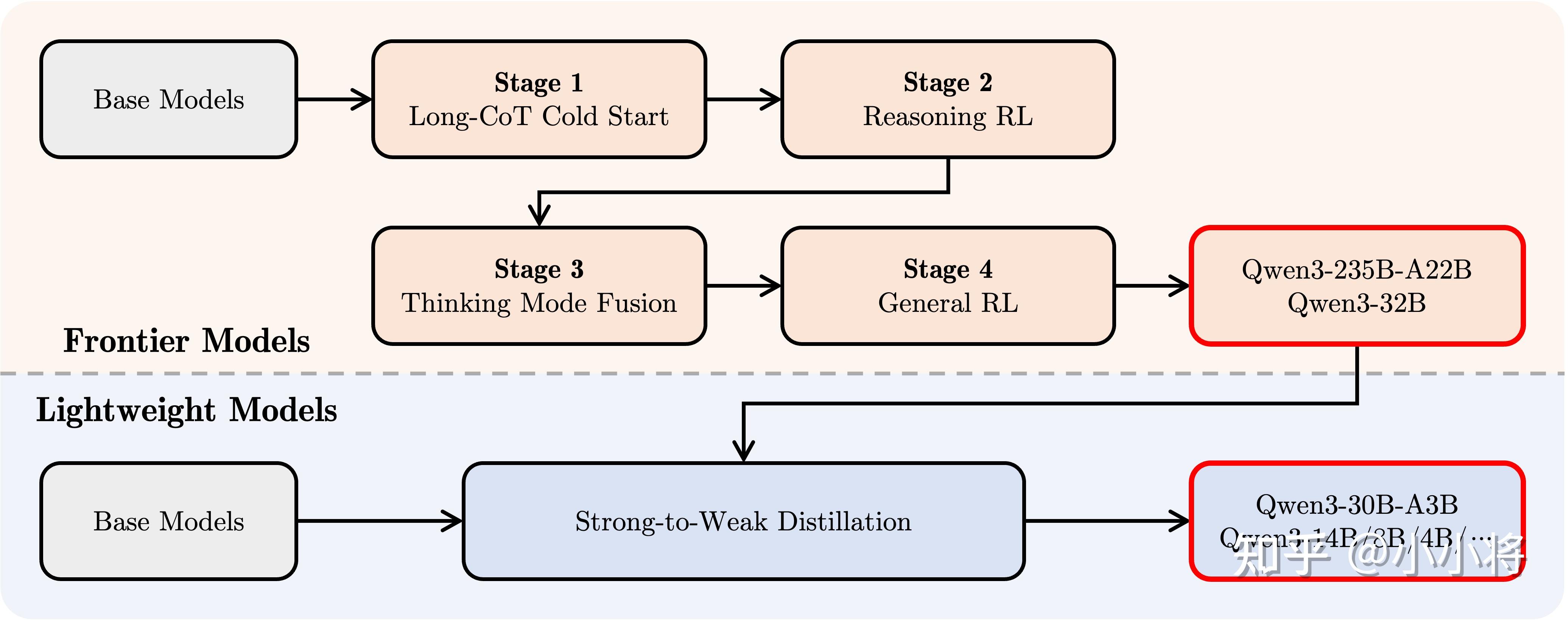 后训练包含四阶段的训练流程:(1)长思维链冷启动,(2)长思维链强化学习,(3)思维模式融合,以及(4)通用强化学习。