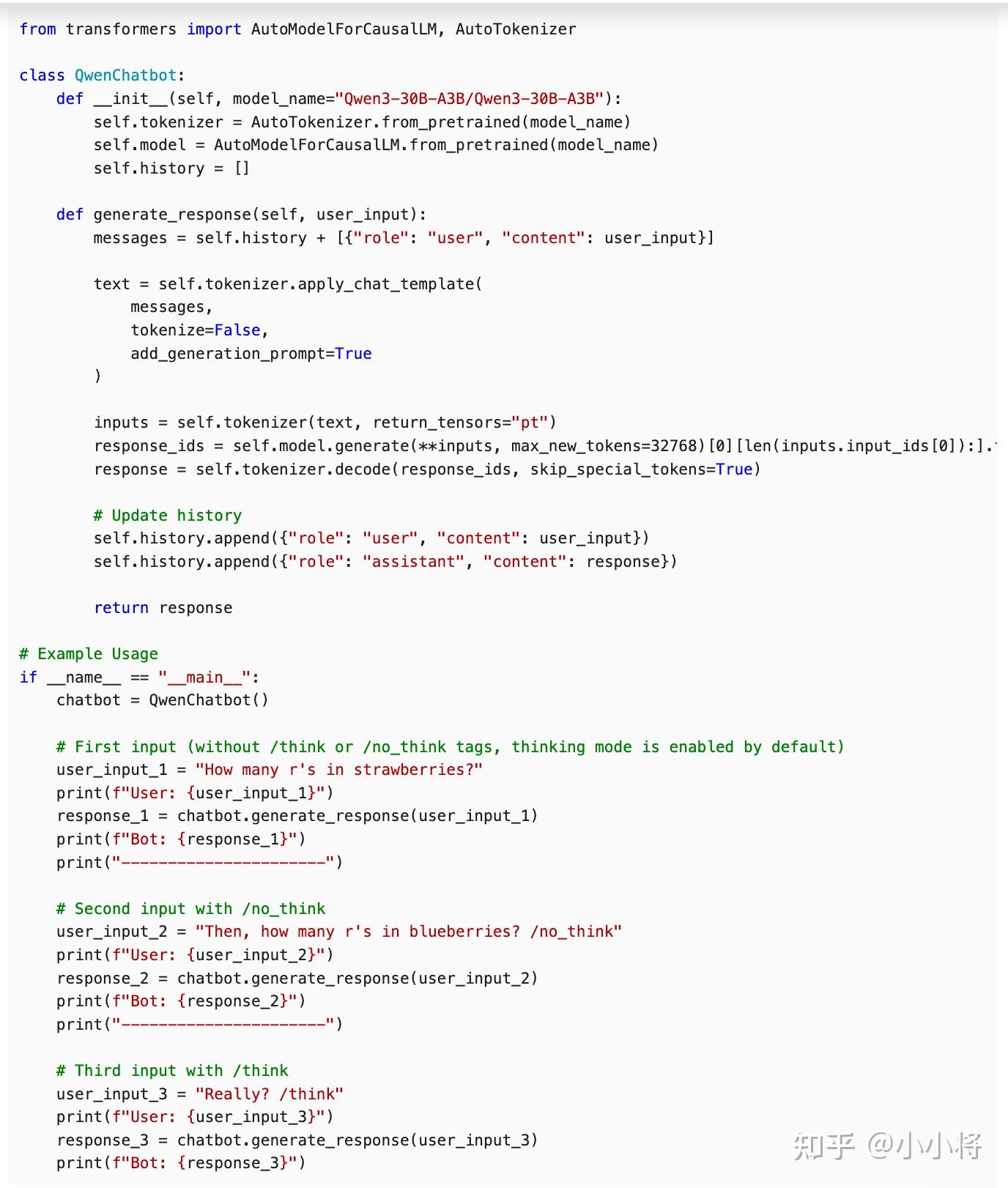 而且,Qwen 3还提供了一种软切换机制来在多轮对话中灵活使用混合思考模式。具体来说,你可以在用户提示或系统消息中添加 /think 和 /no_think 来逐轮切换模型的思考模式。在多轮对话中,模型会遵循最近的指令。