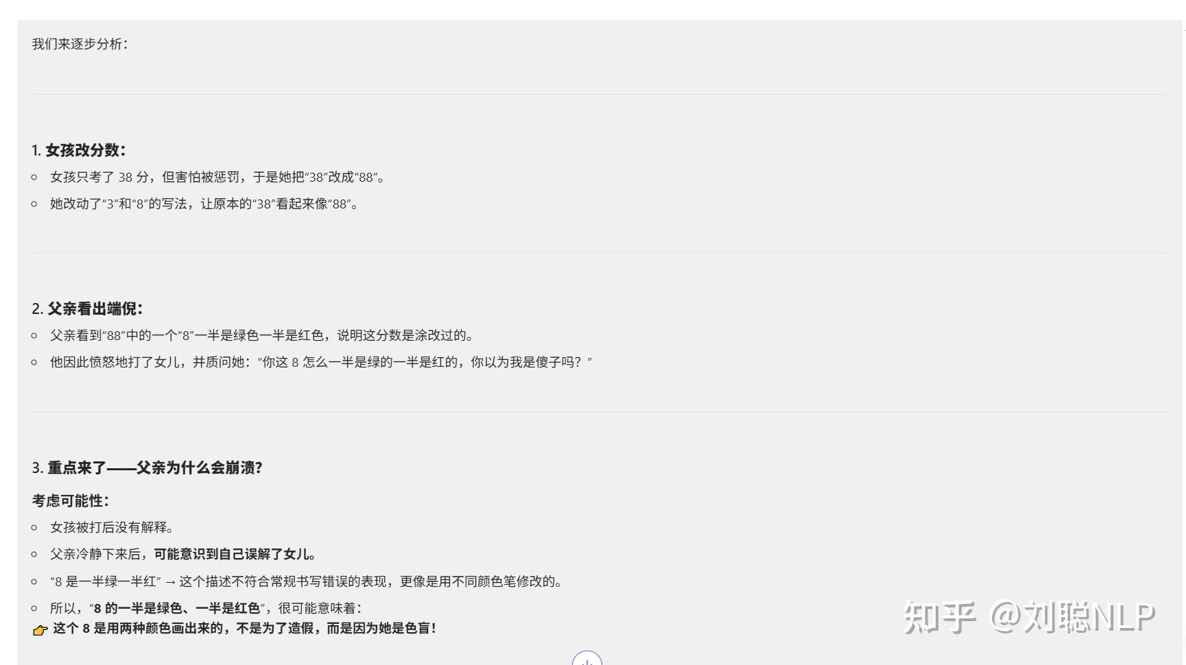 有一天,一个女孩参加数学考试只得了 38 分。她心里对父亲的惩罚充满恐惧,于是偷偷把分数改成了 88 分。她的父亲看到试卷后,怒发冲冠,狠狠地给了她一巴掌,怒吼道:“你这 8 怎么一半是绿的一半是红的,你以为我是傻子吗?”女孩被打后,委屈地哭了起来,什么也没说。过了一会儿,父亲突然崩溃了。请问这位父亲为什么过一会崩溃了?