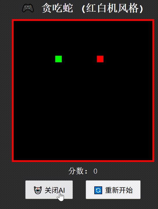 创建一个红白机风格的"贪吃蛇"游戏,包含自动演示AI功能,使用纯HTML/CSS/JavaScript实现为单文件