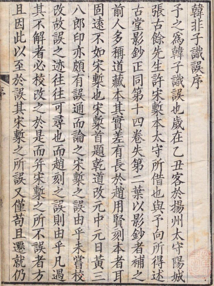 该本《韩非子序》末题「乾道改元中元日黄三八郎印」。这南宋乾道改元中元日(1165年农历7月15日)黄三八郎刊印的《韩非子》,学界习称「乾道本」,是现在尚可从其影钞本中窥见其貌的最早的《韩非子》刻本。黄三八郎书铺是南宋建宁府(治所建安县,即今福建省建瓯市)之书坊。该书坊之刻本并不精善,但由于后来所能见到的《韩非子》刻本以此本为最早,它较能体现古本的面貌,所以受到校雠学者的重视。