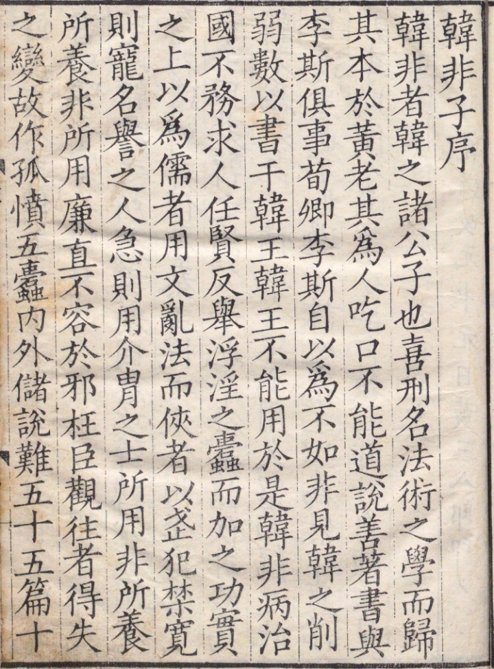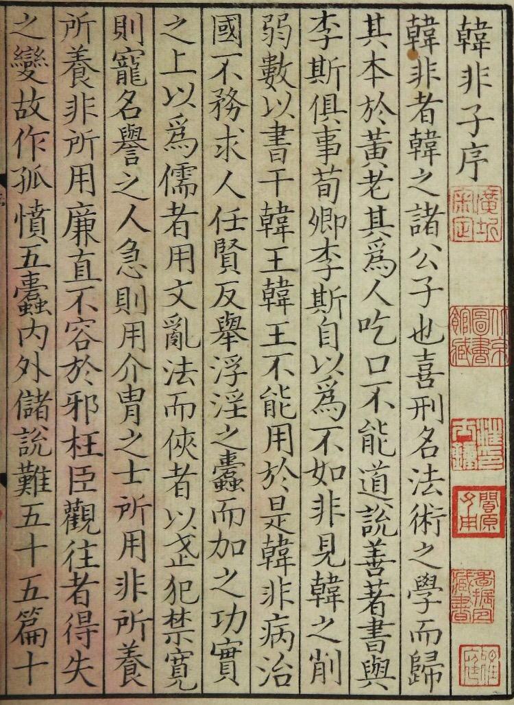 周韩非撰。《汉书·艺文志》载《韩子》五十五篇,张守节《史记正义》引阮孝绪《七录》载《韩子》二十卷,篇数、卷数皆与今本相符。惟王应麟《汉艺文志考》(《汉书艺文志考证》)作五十六篇,殆传写字误也。其注不知何人作。考元至元三年(1266)何犿本,称旧有李瓒注,鄙陋无取,尽为削去云云。则注者当为李瓒。然瓒为何代人,犿未之言。王应麟《玉海》已称《韩子注》,不知谁作,诸书亦别无李瓒注《韩子》之文,不知犿何所据也。犿本仅五十三篇,其《序》称内佚《奸劫》一篇,《说林下》一篇,及《内储说下六微》「内似烦」以下数章。明万历十年(1582)赵用贤购得宋椠,与犿本相校,始知旧本《六微》篇之末尚有二十八条,不止犿所云数章。《说林下》篇之首尚有「伯乐教二人相踶马」等十六章,诸本佚脱其文,以《说林上》篇「田伯鼎好士」章迳接此篇。「虫有虺」章「和氏篇」之末自「和虽献璞而未美,未为王之害也」以下脱三百九十六字。《奸劫》篇之首,自「我以清廉事上」以上脱四百六十字。其脱叶适在两篇之间,故其次篇标题与文俱佚。传写者各误以下篇之半连於上篇,遂求其下篇而不得,其实未尝全佚也。今世所传,又有明周孔教所刊大字本,极为清楷。其《序》不著年月,未知在用贤本前后。考孔教举进士在用贤后十年,疑所见亦宋椠本。故其文均与用贤本同,无所佚阙。今即据以缮录,而校以用贤之本。