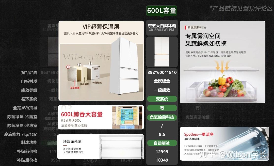 如果大家是想要600L以上更大容量,可选的很少了,东芝大白梨638冰箱是个不错的选择,这款是东芝大爆款,之前只有线下款,现在线上也有了,通过大面积使用成本更高的VIP保温材料,从而实现高容积的600L大容量,双系统、主动除菌、全宽果蔬抽屉、冷藏室面光源、60min自动制冰,并且还有2min制冰清洗和UV杀菌,反正大家能想到的这款也都有,保鲜方面是通过增加UNIT保湿膜,实现高保湿,所以这款主打一个就是空间大,堆料足,想要大容量的朋友重点看这款即可。