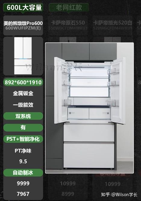 如果你是想要600L以上大容量零嵌冰箱,基本没啥太多可选,直接看美的熊墩墩Pro即可,典型的皮薄馅大,600L以上大容量,整体尺寸跟很多500多L冰箱差不多,双系统、冷藏室PST+智能净化、全宽果蔬抽屉、全景面光源、60min洁净制冰,基本都配置上了,