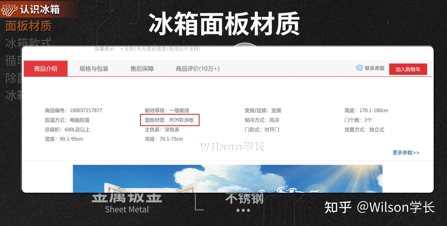 如果再细分的话,金属钣金又可以分为PCM材质、VCM材质以及不锈钢,商品页的这个位置都有标注。