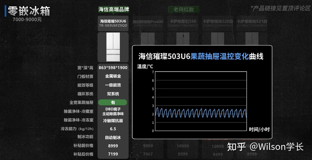海信璀璨503U6大家可以重点关注下,这款我深度测评过,璀璨定位海信的高端品牌,在堆料方面还是很舍得的,基本能用金属的地方都用上了金属,所以看起来比较有质感,而不是那种塑料感,冷藏室背板为金属背板,降温更快,通过多个这种微风道送风,所以冷藏室温度控制更精准,大家可以看下果蔬抽屉的测温结果,