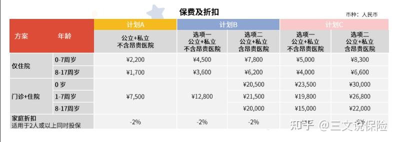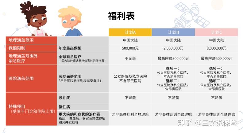 计划C:附加了儿保和疫苗责任,它和计划B相比,保额、门诊次数都有所提高,但最关键的是包含了门诊和疫苗责任。