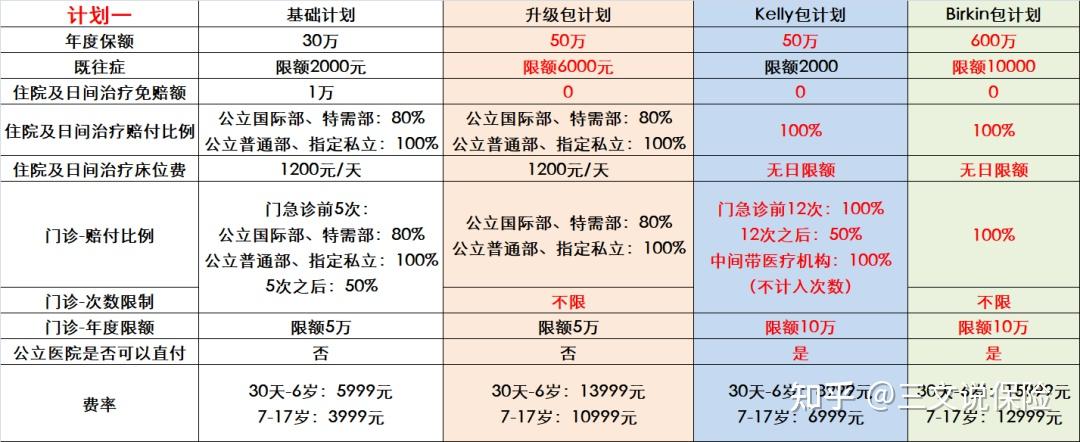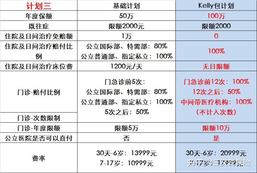 计划三在昂贵医院里增加了新世纪,基础计划6岁以下孩子保费大概1万4,Kelly包12次门诊,保费2万1。
