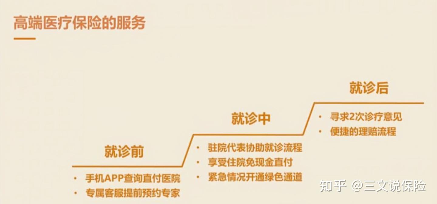 一句话总结,高端医疗保险为客户用较少的代价获取高端的医疗服务,用固定的成本锁定一生的优质医疗资源。
