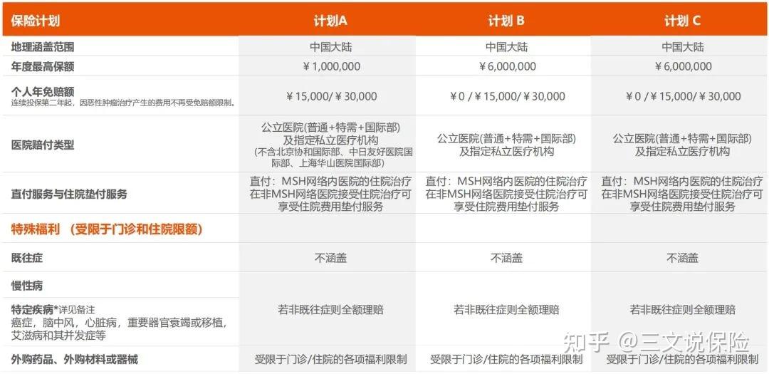 计划A:没啥优势,住院床位费有1500的限额,私立医院基本不够,免赔额1万。门诊限制很多,各种不赔,保费便宜,保障大打折扣。