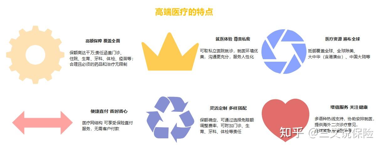 相比于中端医疗险,高端医疗险除了解决免赔额、国际特需部、不限社保保险的问题,