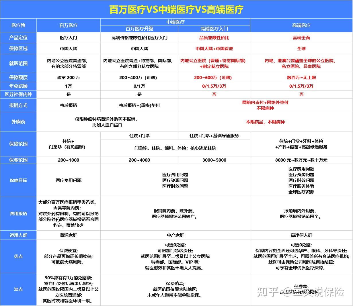 百万医疗、中端医疗、高端医疗有什么区别呢?三文都整理在这张表格里了: