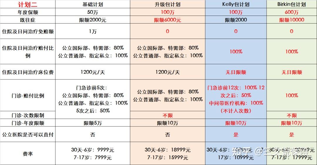 计划二涵盖了昂贵医院(除了新世纪),基础计划6岁以下孩子保费大概1万,Kelly包12次门诊的保费大概1万4。如果不是非要去新世纪,这个计划整体来看也相当能打。