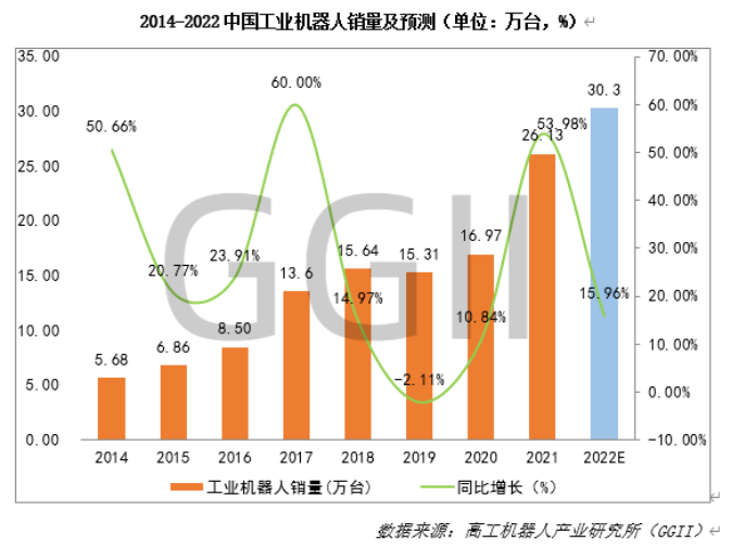 三是工业机器人。前几年受特殊环境影响,各行各业使用机器人的意愿进一步提升,工业机器人市场持续蓬勃发展,市场规模创下历史新高。GGII数据显示,2022年,中国工业机器人销量同比增长约15.96%,全球销量占比超过50%,中国连续九年成为全球最大工业机器人消费国,稳居全球第一大工业机器人市场。(数据来源:证券时报,2023.05.13)