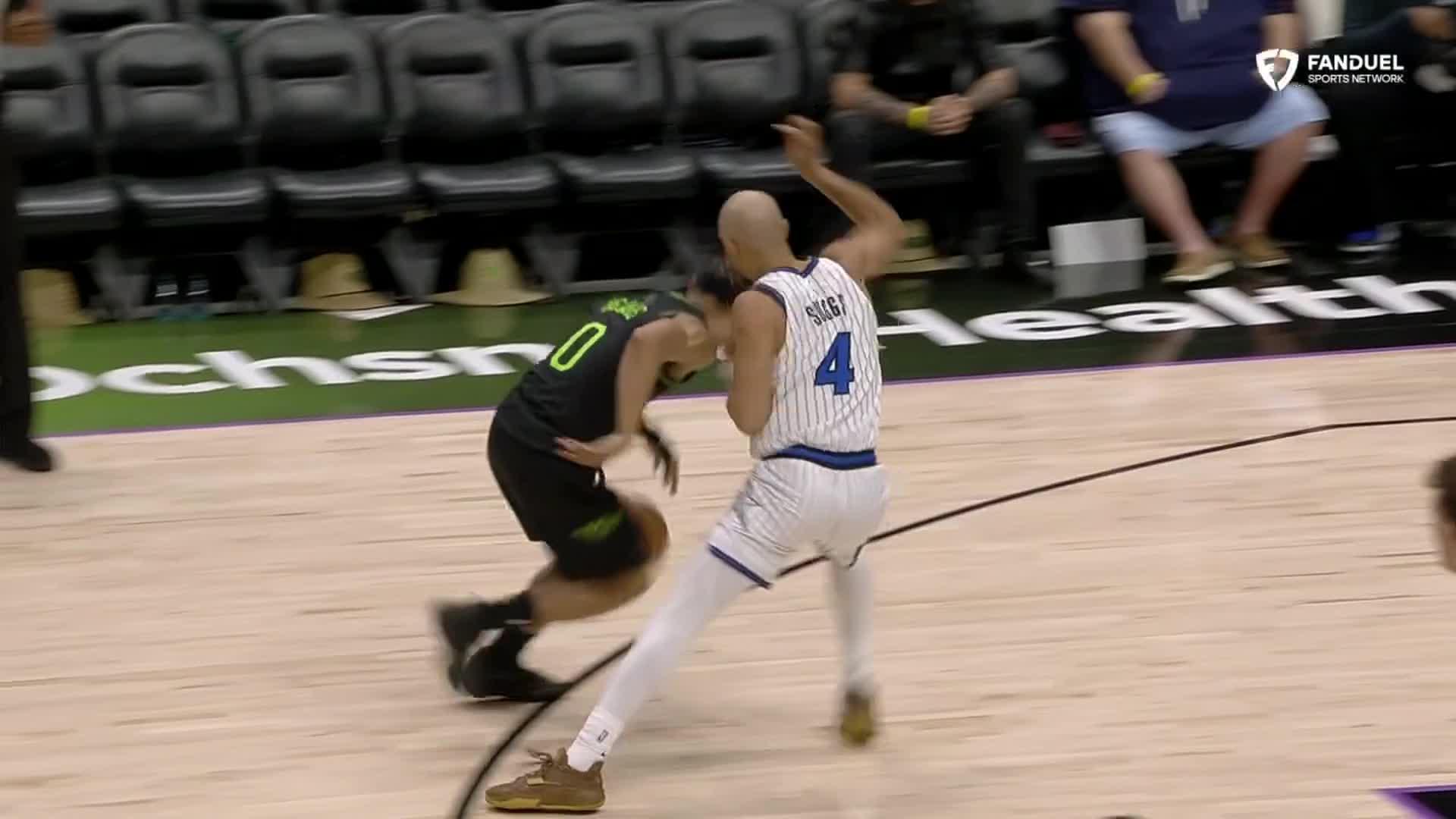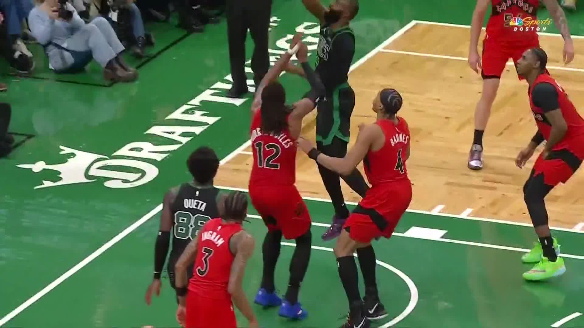 Jaylen Brown has RJ Barrett touching earth on and-1 basket