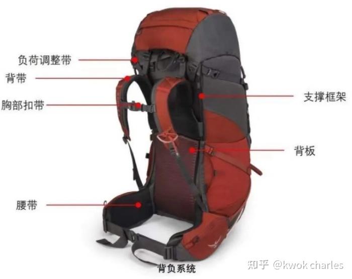 背负系统其结构包括:肩带+胸带+腰带+肩部受力带+支撑装置(支架)+通风装置+调节装置,选购时我们主要看支架、腰带、承重带、肩带和胸带: