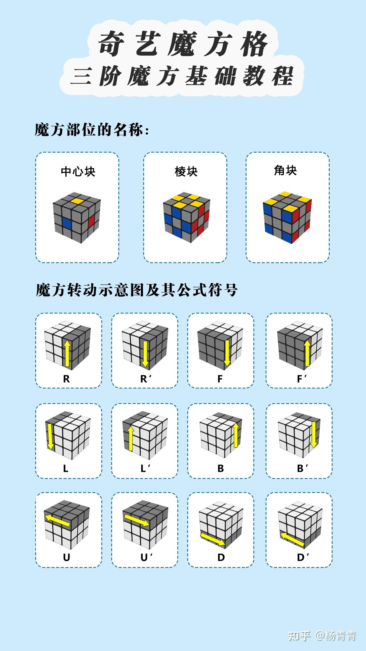魔方转动示意图一定要看懂,只有看懂这步,才能根据后面的公式进行还原。除了第一步没有公式以外,后面的几个步骤都有公式,还需要判断各种情况。