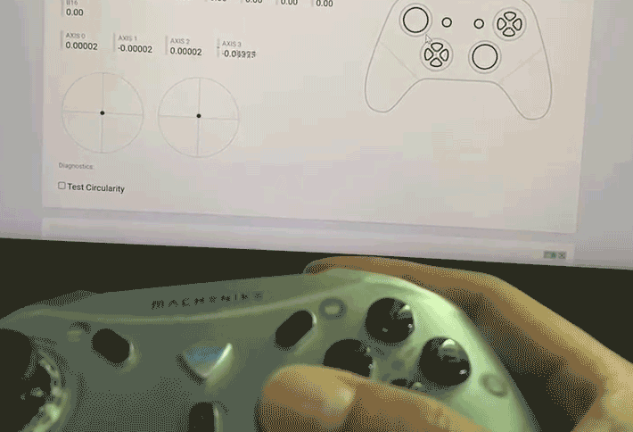 Gamepad Tester测试结果,默认状态手柄左摇杆貌似略有一点中心死区,右摇杆则是0中心死区,全方位操控都很细腻丝滑,无十字粘附,操作非常稳定。