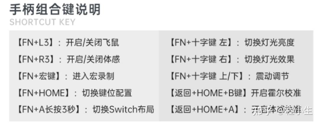 通过组合按键,可以快速调节手柄的灯光亮度、灯带效果、震动强度、开关体感/连发/飞鼠、切换配置、设置按键映射或宏等。