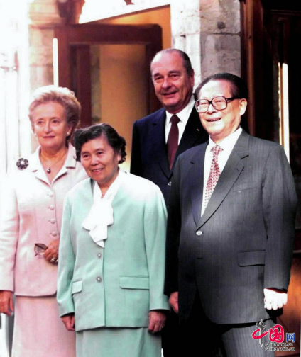 江泽民偕夫人王冶坪与法国总统希拉克和夫人贝尔娜·戴特合影 10月31日——九届全国人大常委会第十二次会议举行第二次全体会议,通过《全国人民代表大会常务委员会关于取缔邪教组织、防范和惩治邪教活动的决定》。会议根据中华人民共和国中央军事委员会主席江泽民的提名,任命胡锦涛为中华人民共和国中央军事委员会副主席 [47]。 11月