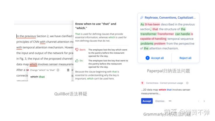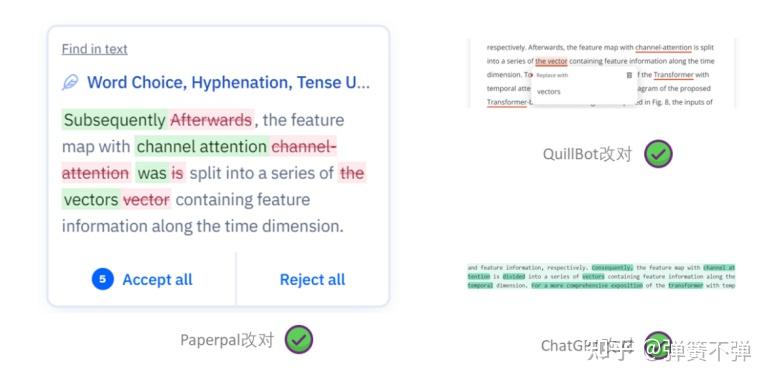 Grammarly和QuillBot没有识别出后文的隐藏线索,而ChatGPT和Paperpal则在这句的编辑中展示了对语法和语境的两重理解。