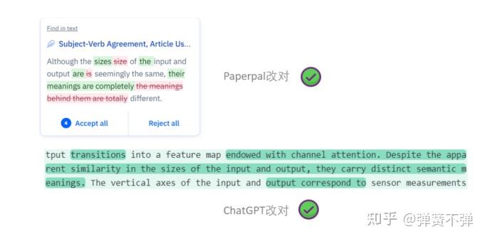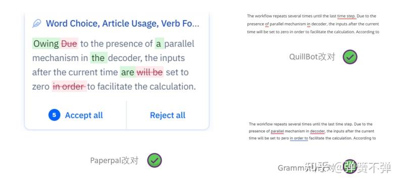 这两处错误Grammarly、Paperpal、QuillBot都修改正确;ChatGPT识别出句子少了两个冠词,但其中一处校正有误,将a parallel mechanism前的冠词写作the。