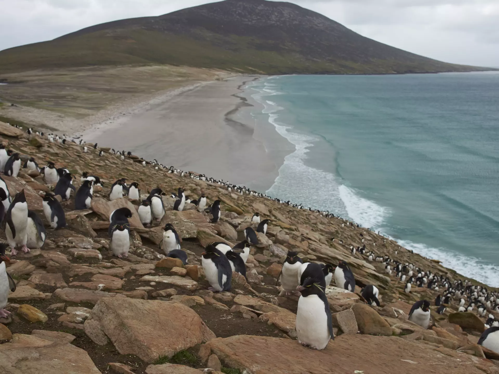 Colony of Rockhopper Penguins (Eudyptes chrysocome) on the cliffs above The Neck on Saunders Island in the Falkland Islands. JeremyRichards / Lonely Planet