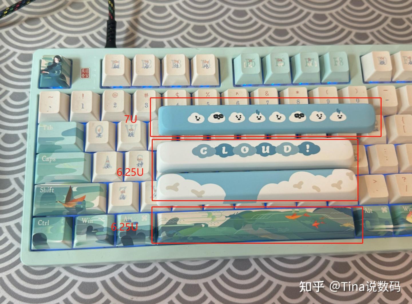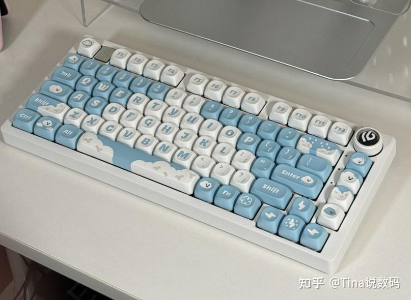 云团外设的原创云朵主题键帽,PBT五面热升华工艺,手感好。搭配白色和蓝色套件键盘都很好看。baby 蓝的配色很清晰,夏日蓝天白云氛围感拿捏!CLOUD 有做两款风格,可以随意搭配。
