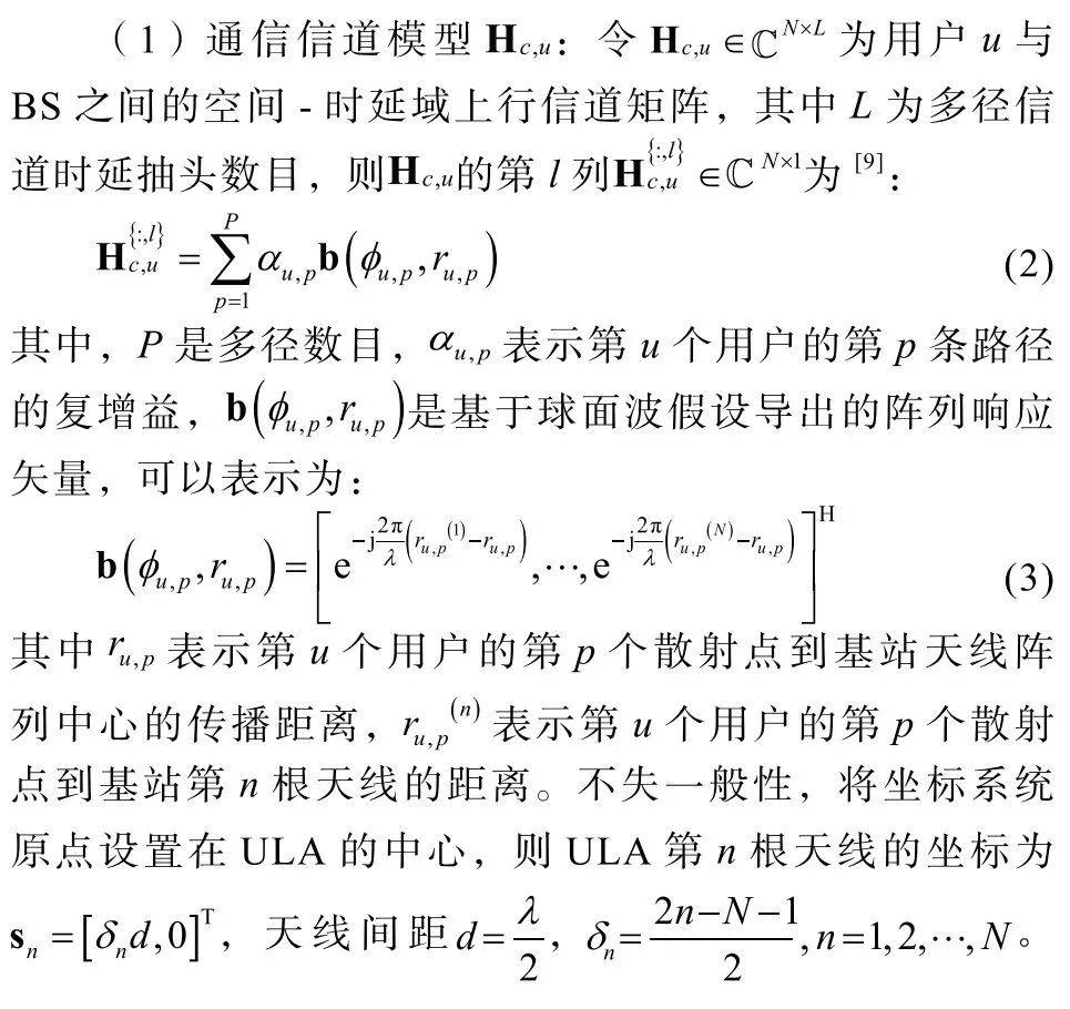 然而,XL-MIMO-ISAC中部署大量天线给获取准确的信道状态信息(CSIChannel State Information)和目标感知参数带来巨大挑战。文献[8]利用张量将CSI与目标感知参数(角度、时延和多普勒频移)建模为多项式分解问题。文献[9]提出了一种两步的方法来联合估计ISAC大规模MIMO正交频分复用(OFDMOrthogonal Frequency Division Multiplexing)系统的CSI和到达方向(DoADirection of Arrival),首先进行空间-时延域CSI和DoA的初步估计,然后根据信道多径分簇分布特征分别提升CSI和DoA精度。然而,随着天线阵列孔径的增加,XL-MIMO-ISAC的通信信道与感知阵列响应均呈现出球面波前效应,即移动用户和感知目标位于天线阵列的近场区域,这使得传统的远场电磁传播假设的CSI与目标参数估计方法受到限制[10-12]。相较于传统的远场ISAC系统,近场ISAC的设计需要在通信信道和感知阵列响应变量中皆引入额外的距离维度[4,13-14]。引入距离维度一方面确实给信道和感知参数估计带来挑战,但另一方面也为通信和感知相关的应用提供更多维度的推断依据,从而增强性能。然而,现阶段尚未见针对近场ISAC系统的联合CSI与感知目标参数估计方面的研究工作。