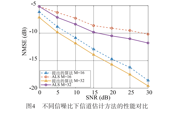 图4展示了所提出算法的信道估计NMSE性能随SNR的变化情况,其中考虑了基于ALS方法。所提出算法训练导频占用子载波数为M=[16,32]。可以观察到,所提出的算法在较少的训练开销下实现了更优的性能。这表明,随着SNR的增加,基于ALS的方法在NMSE性能上遇到瓶颈,因为它未能解决通信与感知信号之间的混叠问题。而所提出的算法随着训练符号数量的增加而产生了改进的估计性能。