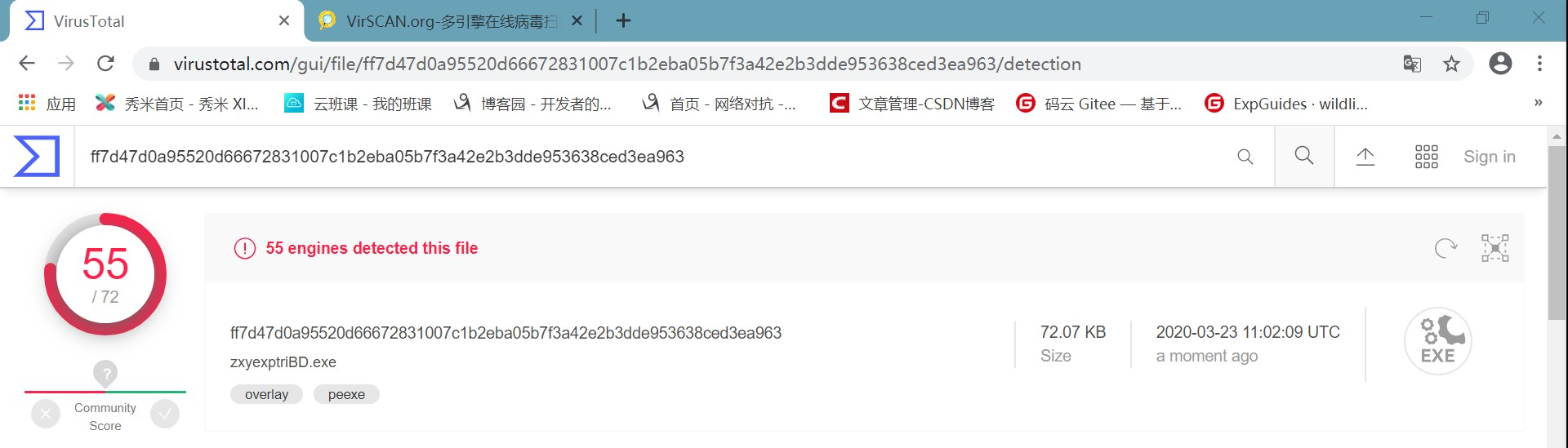 zxy_20175227_backdoor.exe分别上传至两个网站进行筛查,结果如下: