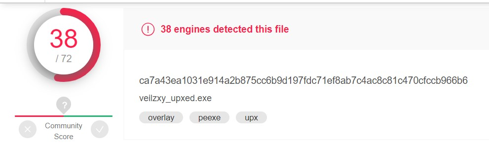 veilzxy.exe加壳,拷贝到主机(我的杀软没有检测到威胁诶),上传到两个平台检测,结果如下: