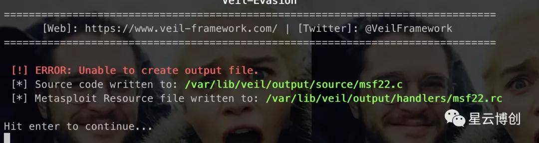 执行evil:docker run -it -v /tmp/veil-output:/var/lib/veil/output:Z mattiasohlsson/veil