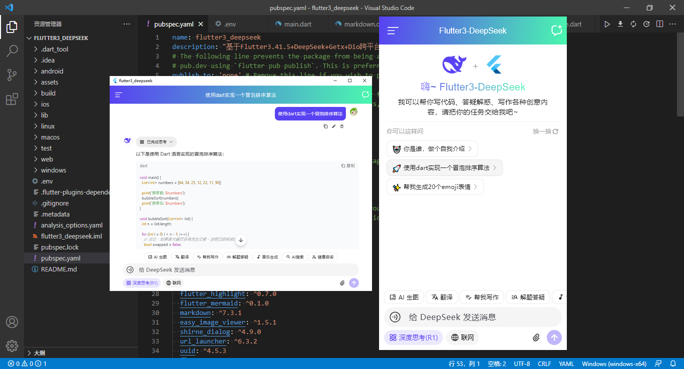 最新原创研发flutter3.41.5+dart3+dio+get快速构建一款android/ios跨平台ai智能流式输出对话app应用。 功能特性如下: Flutter3.41搭建项目,接入DeepSeek-V3,对话丝滑流畅 新增深度思考 新增l